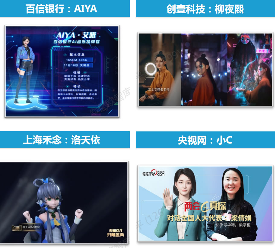央視虛擬主播小C 冬奧宣推官虛擬主播冬冬 歌手洛天依 博主柳夜熙 AYAYI 虛擬偶像翎Ling 清華學生華智冰 虛擬人蘇小妹 航天員小浄 藝術家哈醬