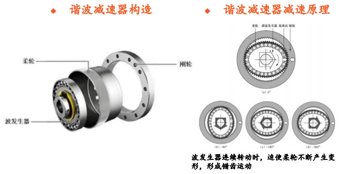 諧波減速器是一種靠波發生器使柔輪產生可控的彈性變形波,通過其與剛輪的相互作用,實現運動和動力傳遞的傳動裝 置。諧波減速器具有單級傳動比大、體積小、質量小、運動精度高等特征