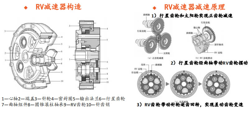 RV減速器是是旋轉矢量(Rotary Vector)減速器的簡稱,它是在傳統擺線針輪、行星齒輪傳動裝置的基礎上發展而來的 一種新型傳動裝置。RV減速器由第一級漸開線圓柱齒輪行星減速機構和第二級擺線針輪行星減速機構兩部分組成,通過 2級變速實現減速功能,負載能力、剛度、抗疲勞度較好。