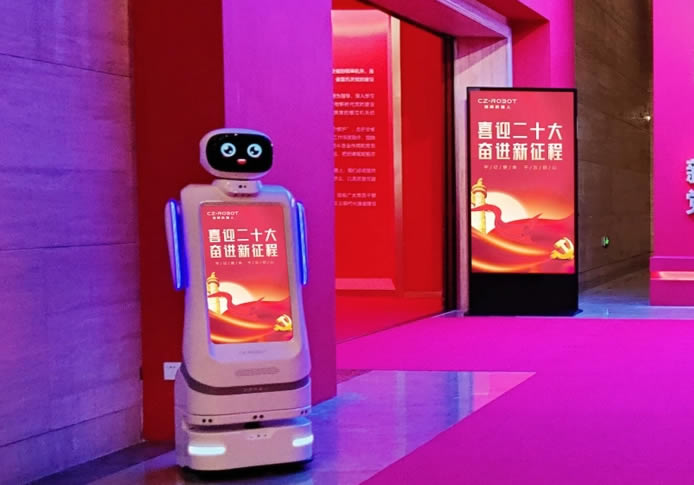 創澤智能展廳機器人以人工智能技術為核心,推出智慧展館服務機器人解決方案,助力智慧展廳實現智能升級、服務升級和展示升級。該解決方案基於人工智能技術,提供了智慧迎賓、智能導覽講解、知識問答、參觀互動等多種功能。