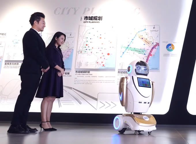 機器人通過語音交互,了解觀眾目的地,自主規劃路徑帶領觀眾到達指定地點,途中自主避讓行人及其它障礙物。準確解答展館位置分布和展品信息,並引導觀眾前往指定目的地。