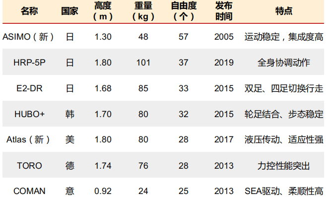 群雄並起,逐鹿人形機器人。日韓在人形機器人領域布局早,研究表現活躍;美國在人形機器人領域後來居上。波士頓動力研發的代表產品Atlas身高1.8m,體重80kg,具有28個關節,可完成原地起跳轉身一周等流暢、高難度的“跑酷”動作,但主 要聚焦在科研領域,商業價值低。