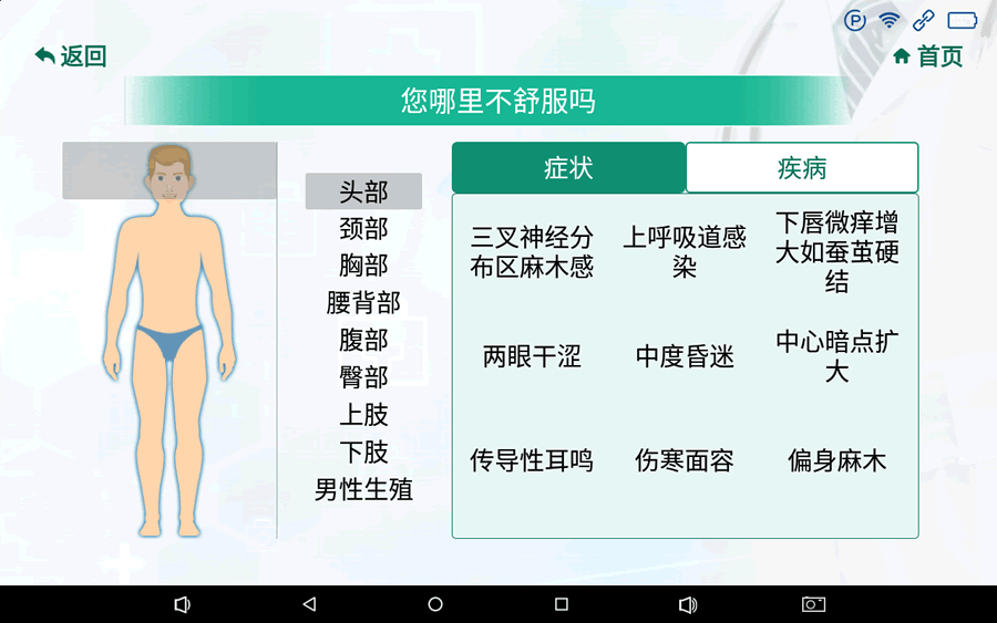 2.進入症狀疾病選擇頁麵,選擇哪裏不舒服或直接選擇疾病名稱進行導診;