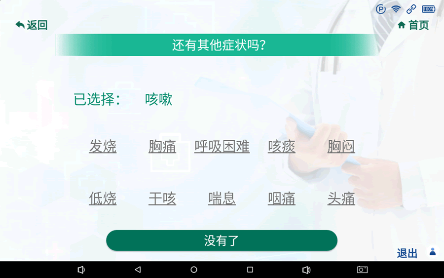 1.通過點擊首頁預檢分診按鈕或語音“預檢分診”進入性別和年齡選擇頁麵,通過點擊屏幕或直接語音如(30歲男性)選擇患者的性別和年齡,然後跳轉到症狀或疾病選擇頁麵;