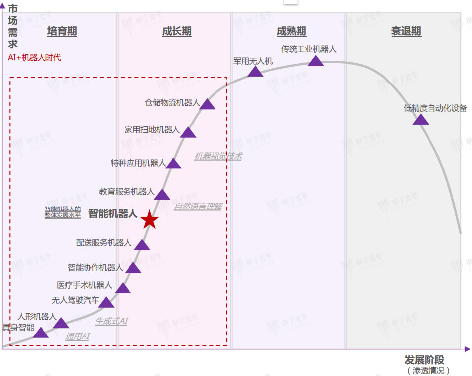 憑借機器視覺、自然語言理解等人工智能技術的發展,初代“AI+”機器人產品逐步成熟, 在特定領域形成已經形成規模應用,處於成長期;