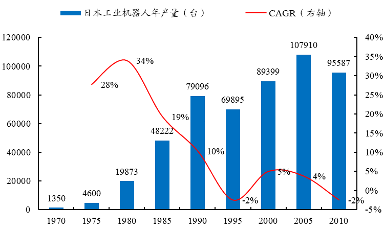 日本工業機器人年產量由 1970 年的 1350 台猛增到 1980 年的 19843 台,年均增長率為 30.8%,處於爆發性增長的 初級階段。