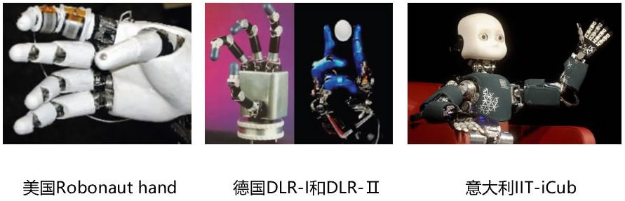 2) 德國宇航中心先後研製成功了 DLR-Ⅰ和 DLR-Ⅱ靈巧手,共集成了 25 個傳感器, 包括類似人工皮膚的觸覺傳感器、關節扭矩傳感器、位置傳感器和溫度傳感器 等,靈巧手在靈活性和感知能力方麵有顯著提升。